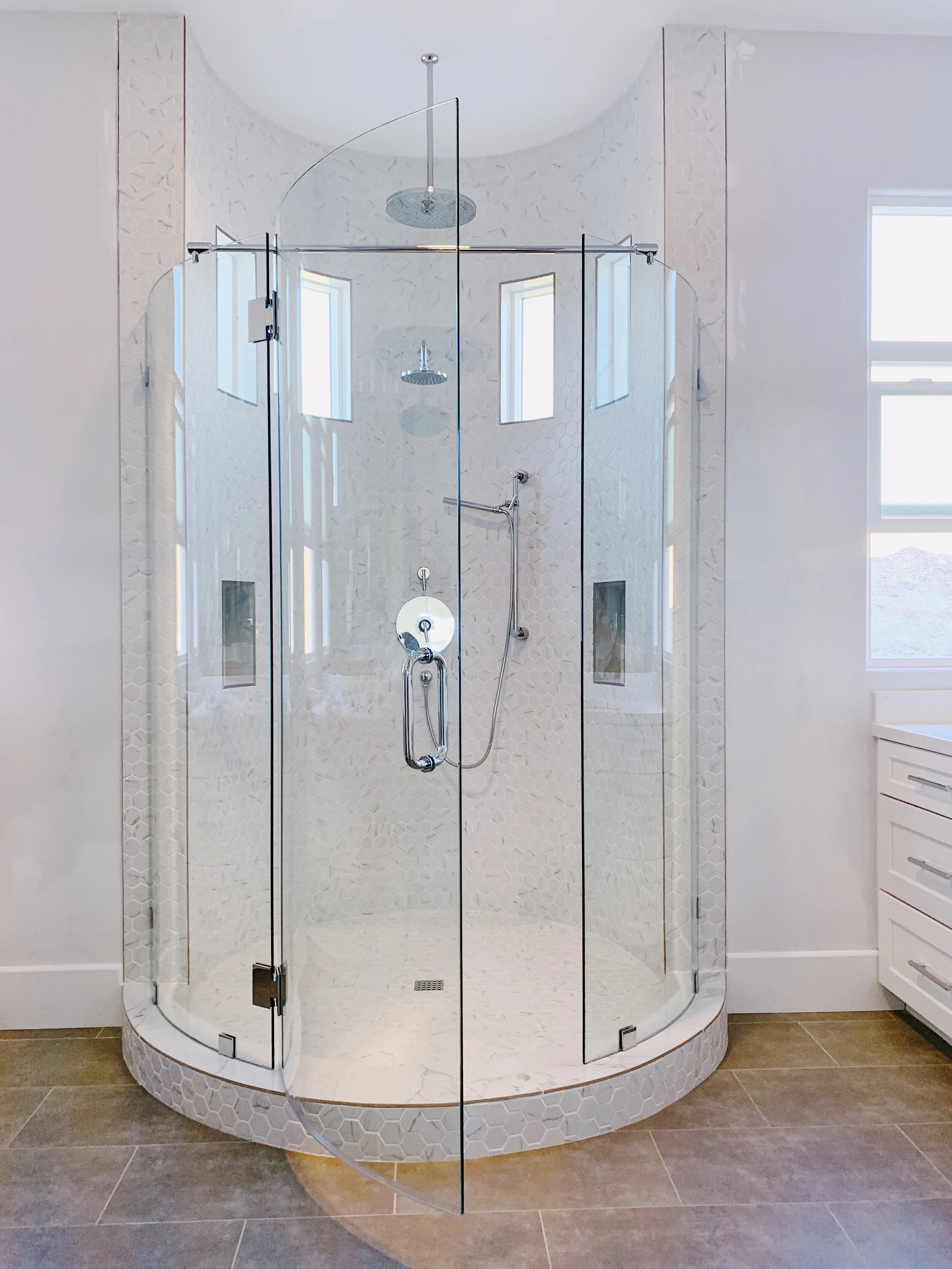 Bent glass is a specialty product that has many architectural applications including stair & balcony railings, shower enclosures, fire pits, entrance systems, skylights, building facades and much more. We view bent glass as a way to add a modern, sleek, and elevated aesthetic to your existing design. To bring your vision to life, our luxurious bent glass seamlessly fits into your space, while retaining the beautiful views. We would be thrilled to help you incorporate bent glass on your next project.