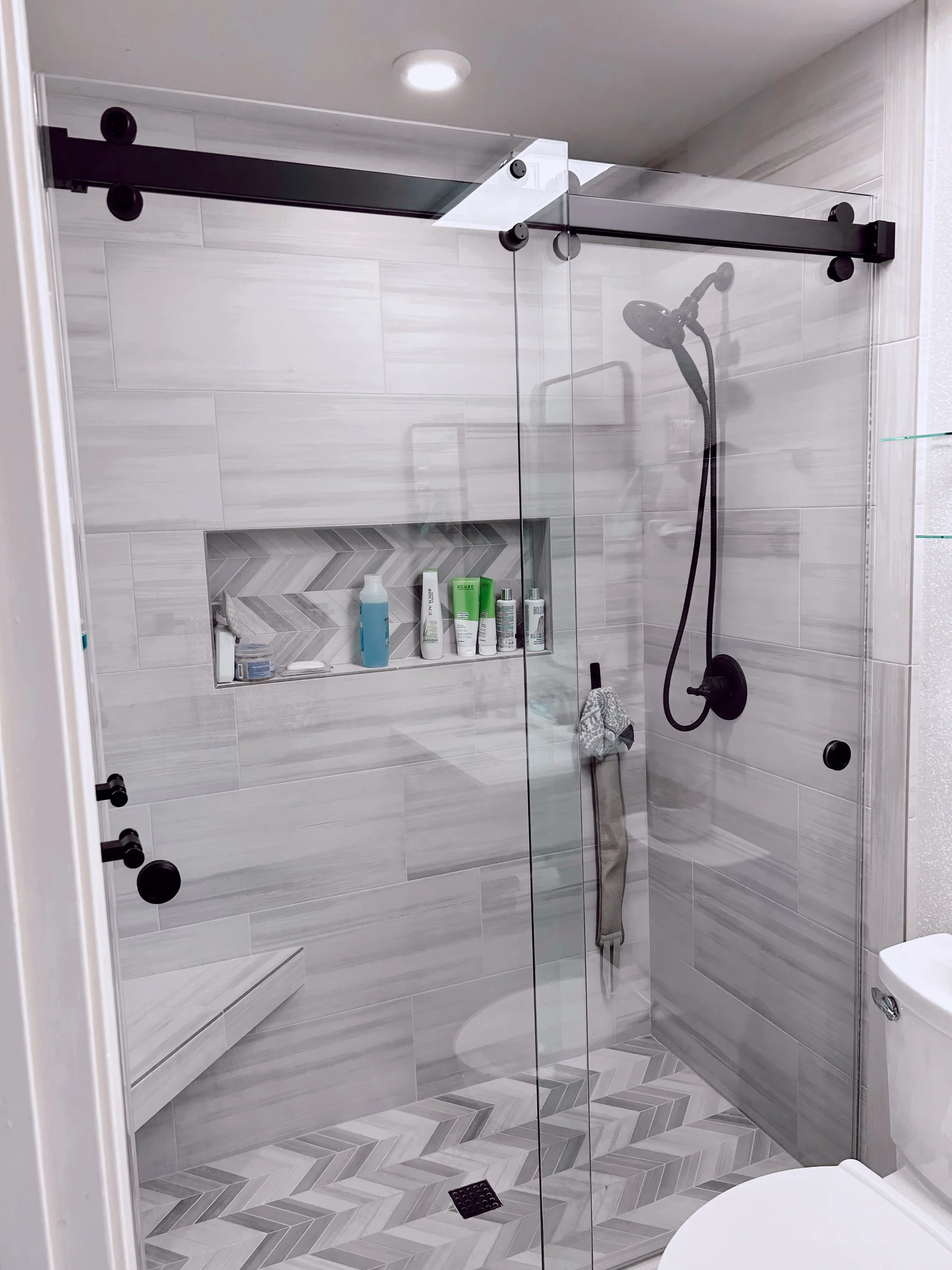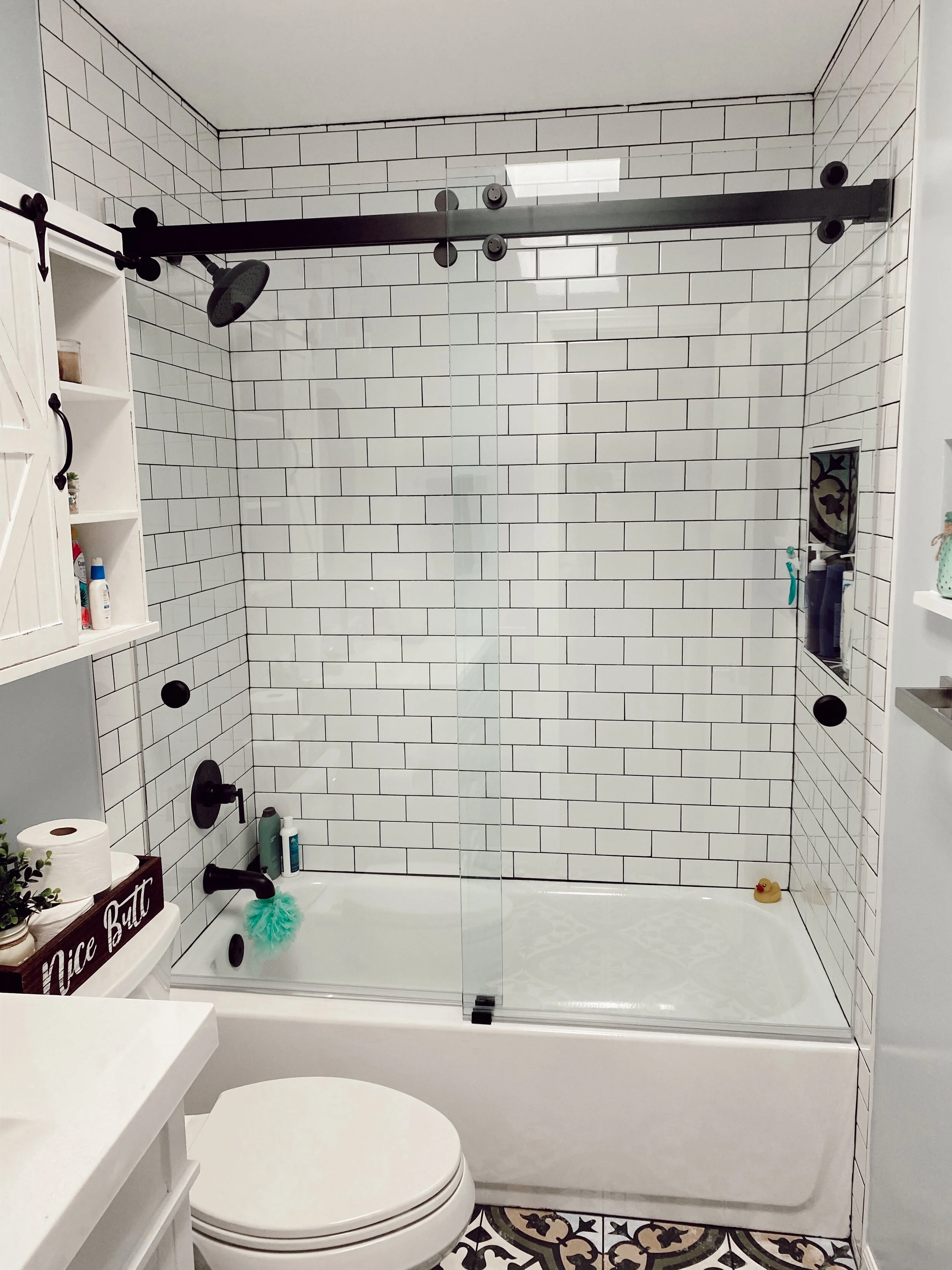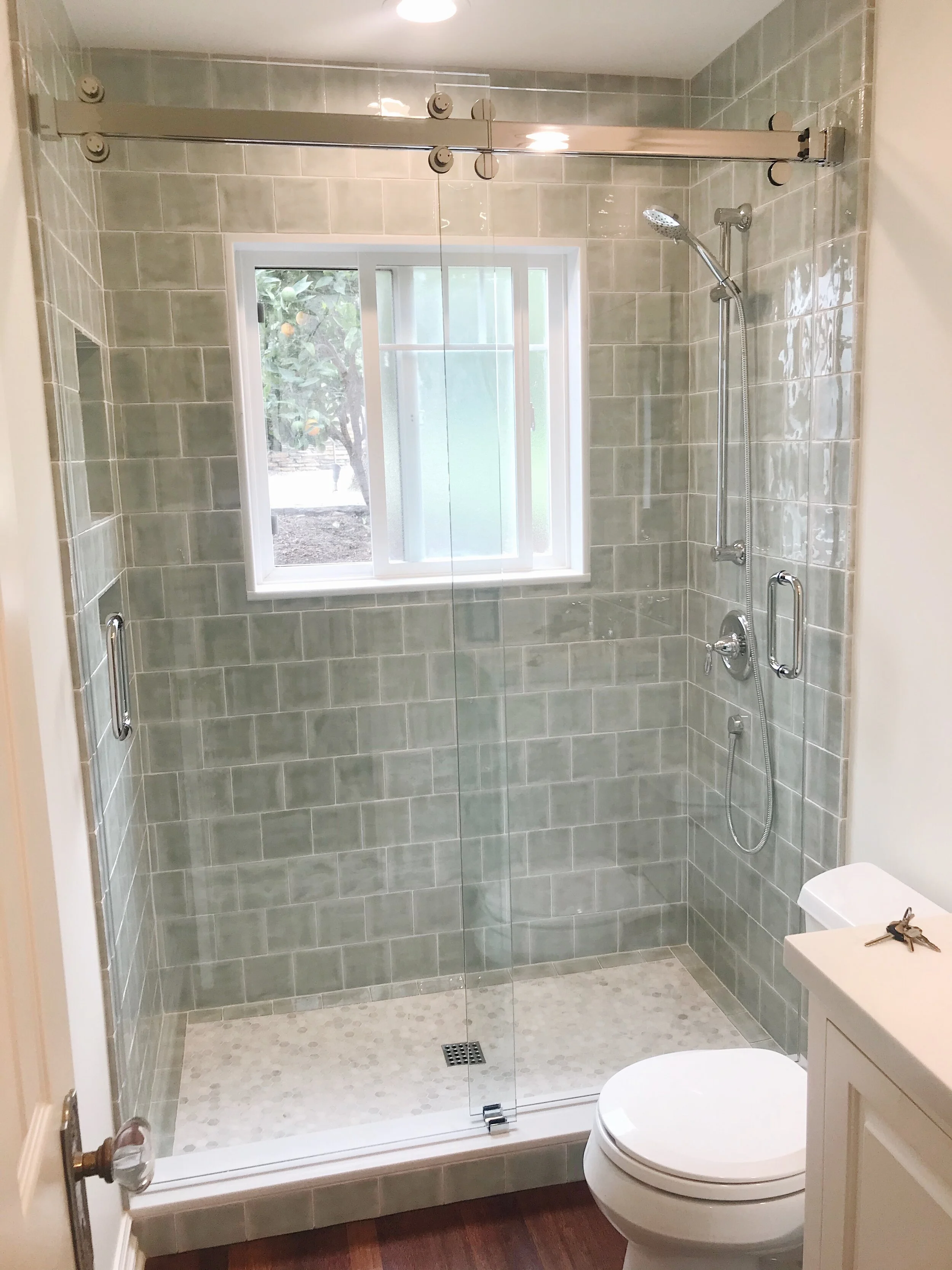 The “Cambridge Series” Barn Style Door is manufactured by: CRLaurence Company. This modern square shaped top rail and wheels come in different hardware finishes to match your unique bathroom.