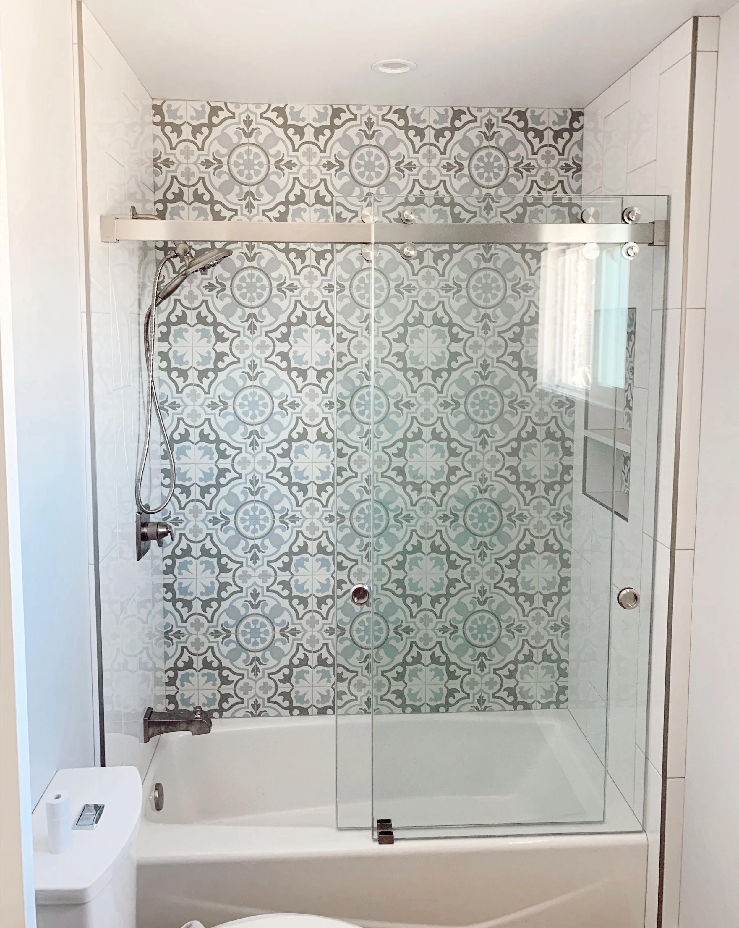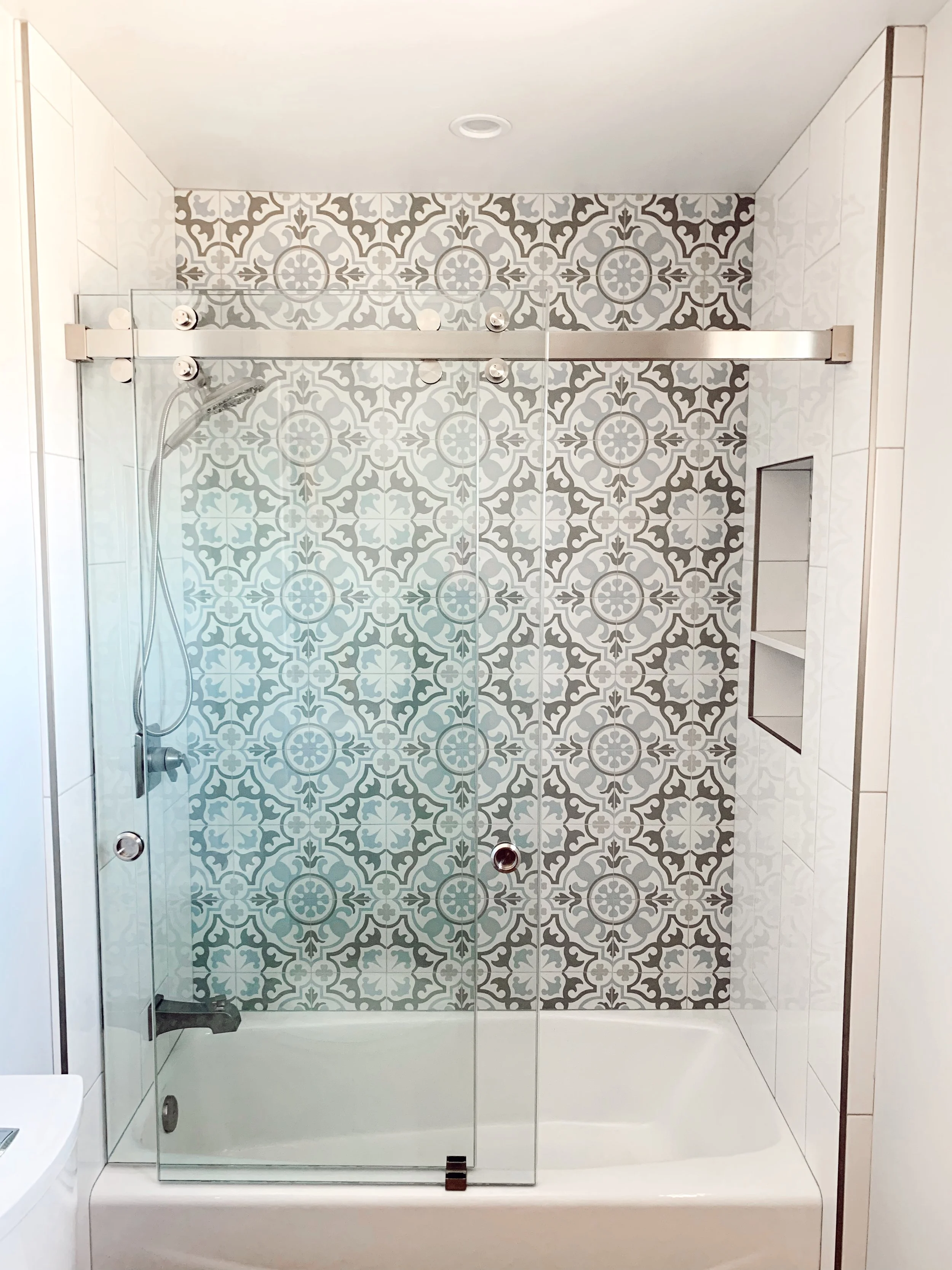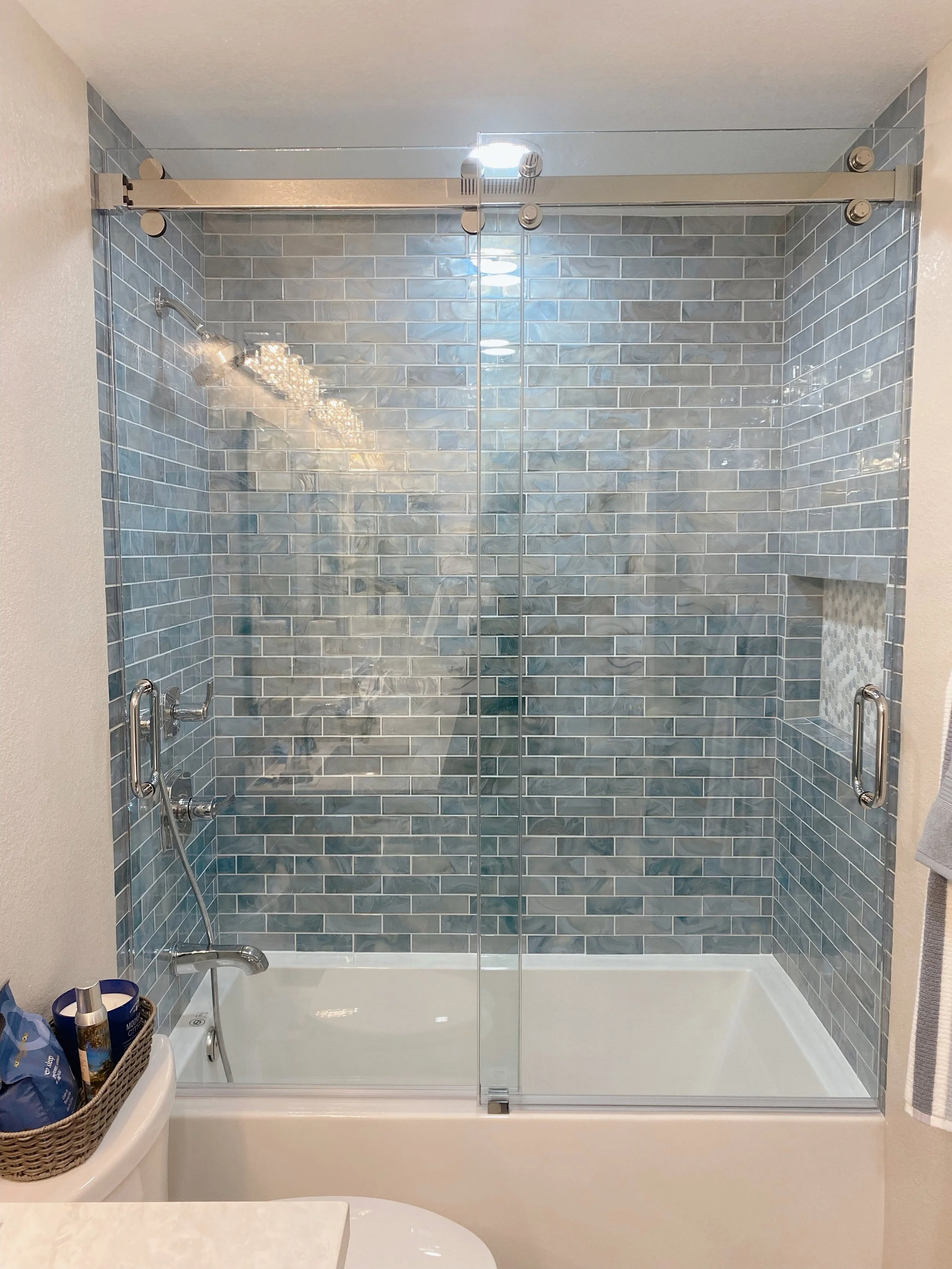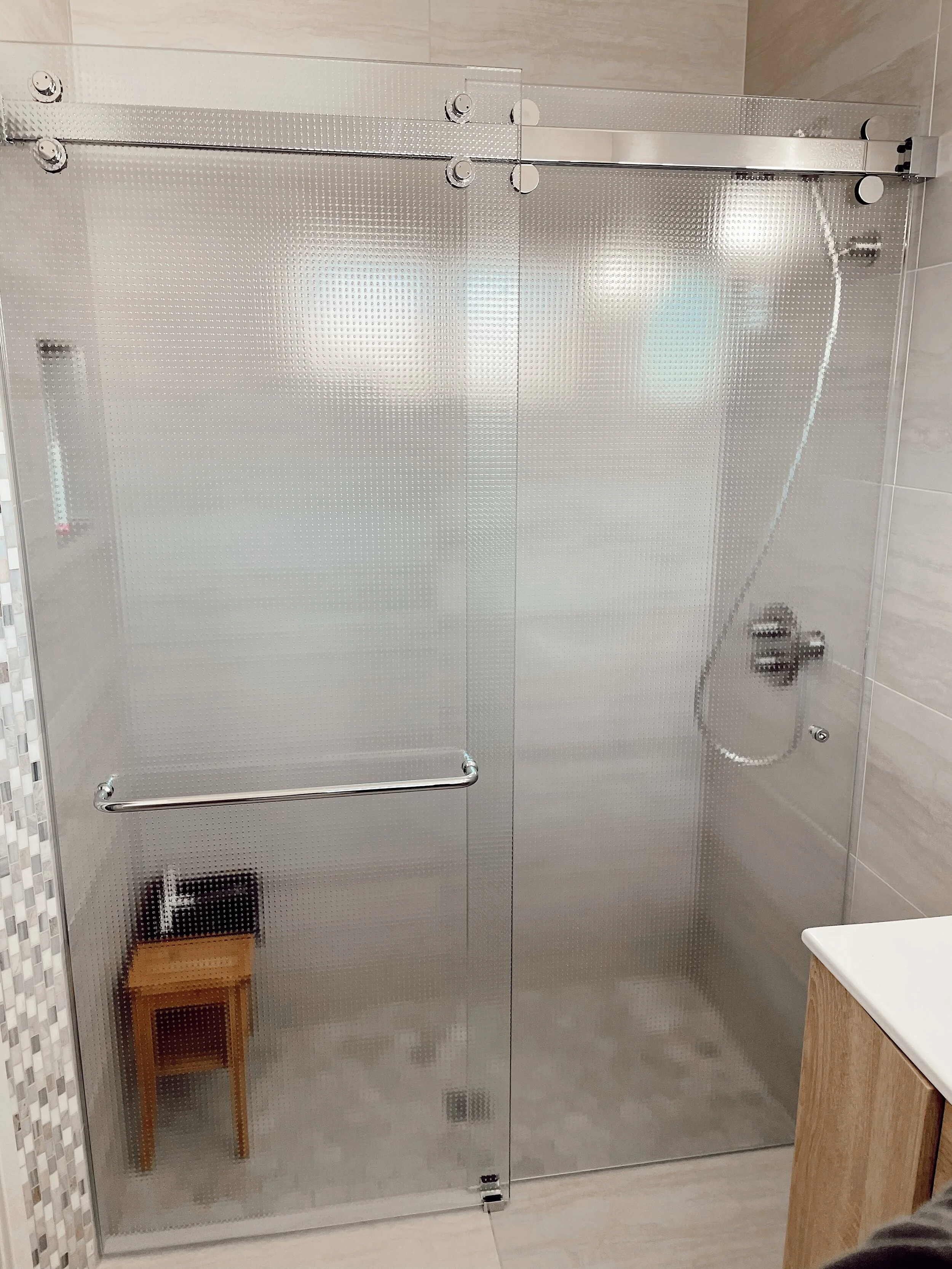 This sliding kit can be installed on both a tiled stand up shower or a shower tub.