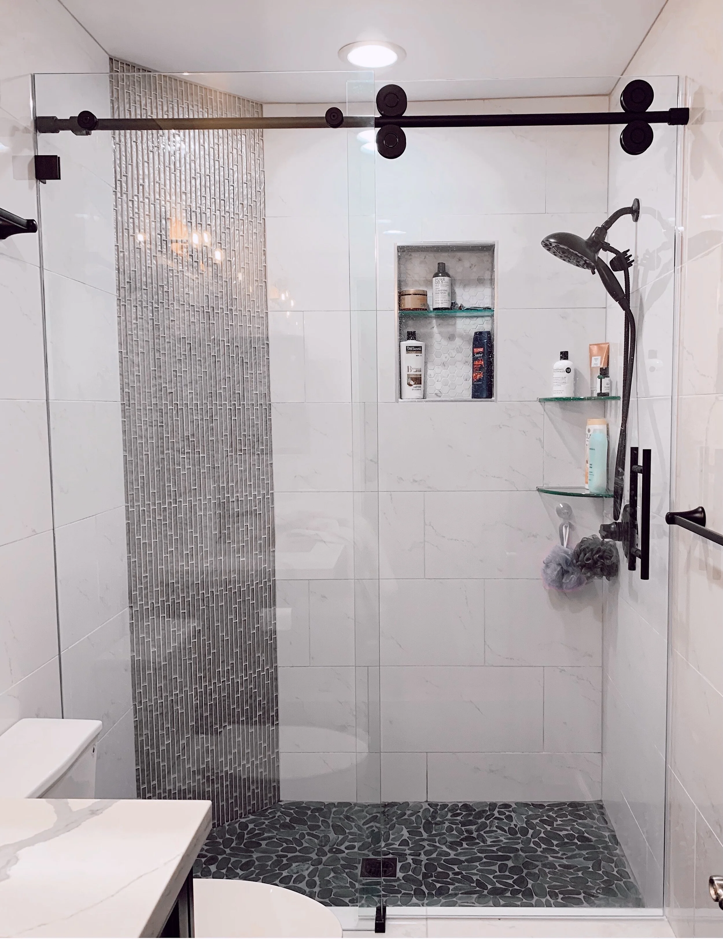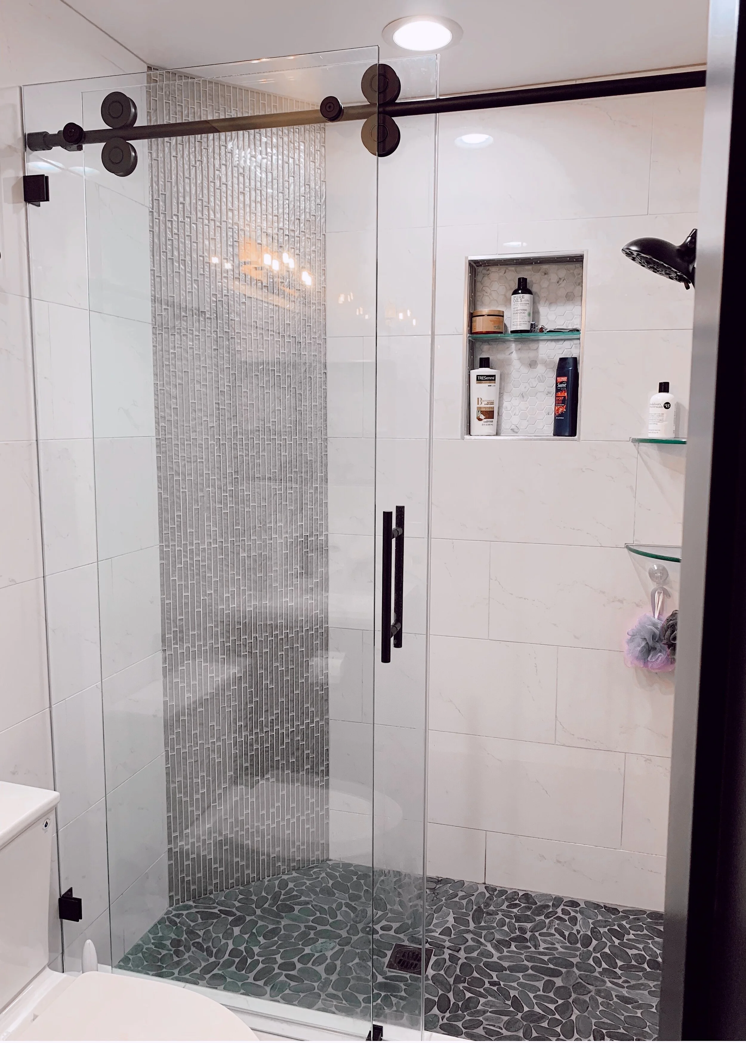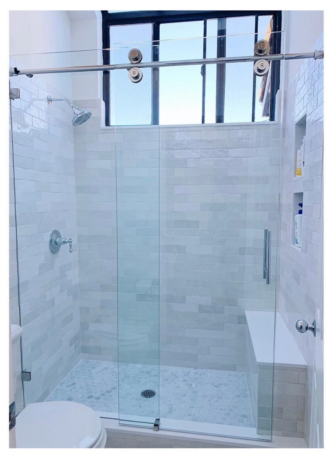 The “Crescent Series” Barn Style Door is manufactured by: CRLaurence Company. This modern round shaped top rail and wheels come in different hardware finishes to match your unique bathroom.