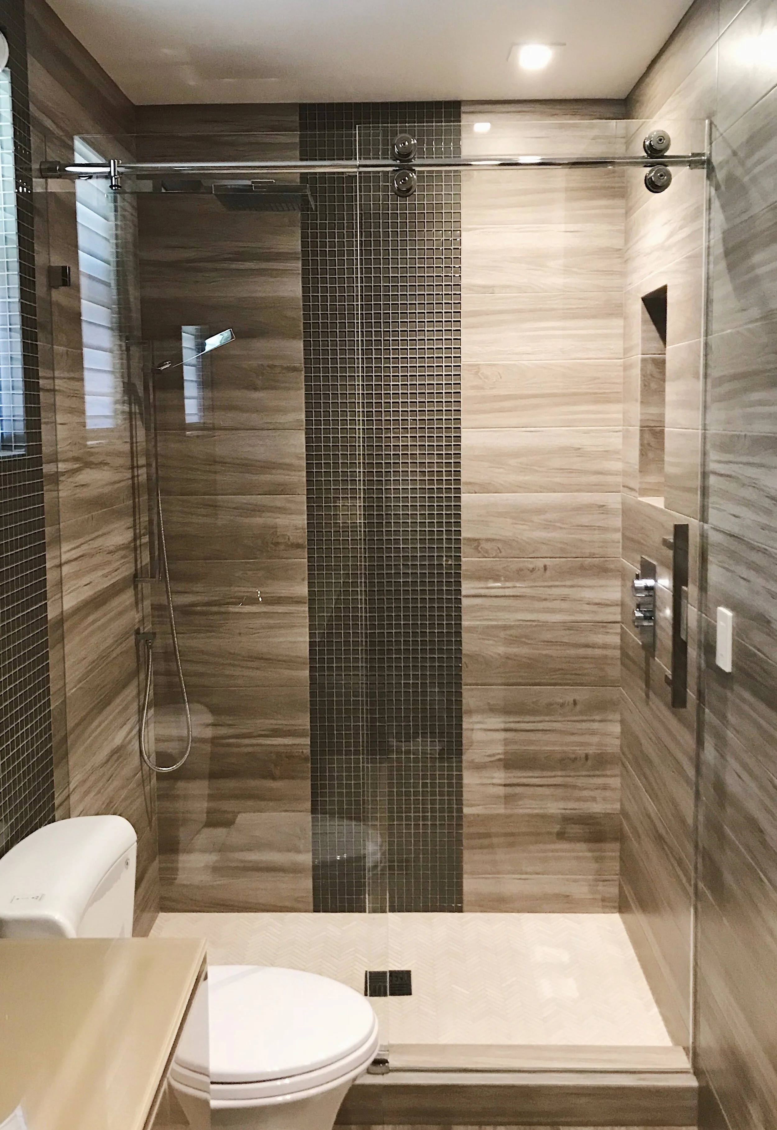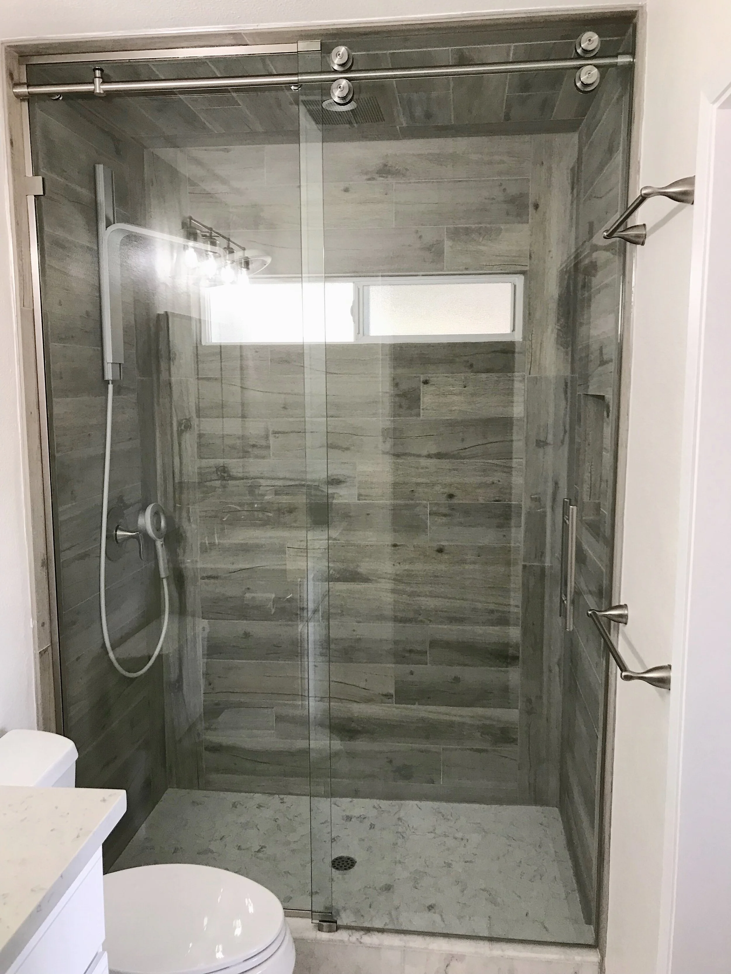 This sliding kit can be installed on both a tiled stand up shower or a shower tub.